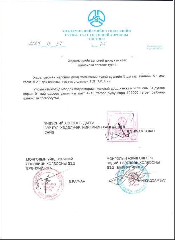 Хөдөлмөр, нийгмийн түншлэлийн гурван талт үндэсний хорооны “Хөдөлмөрийн хөлсний доод хэмжээг шинэчлэн тогтоох тухай” 2024 оны 03 дугаар тогтоол 2025 оны 04 дүгээр сарын 01-ний өдрөөс эхлэн үйлчилж байна.