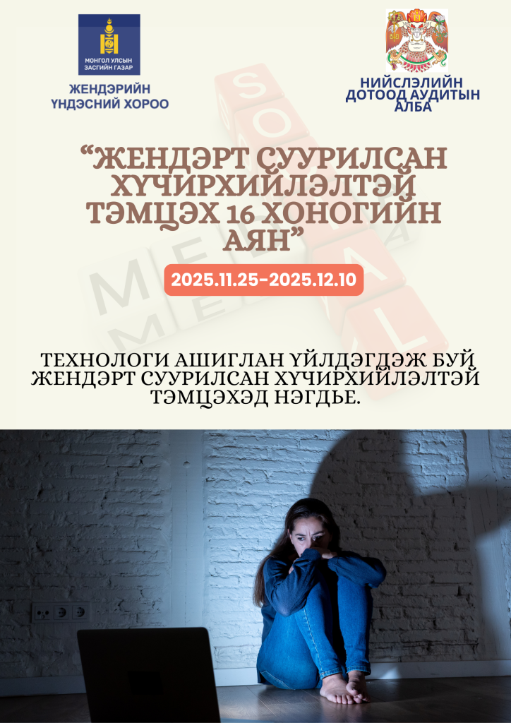 “ЖЕНДЭРТ СУУРИЛСАН ХҮЧИРХИЙЛЭЛТЭЙ ТЭМЦЭХ 16 ХОНОГИЙН АЯН”-д Нийслэлийн Дотоод Аудитын албаны хамт олон нэгдэж байна.
