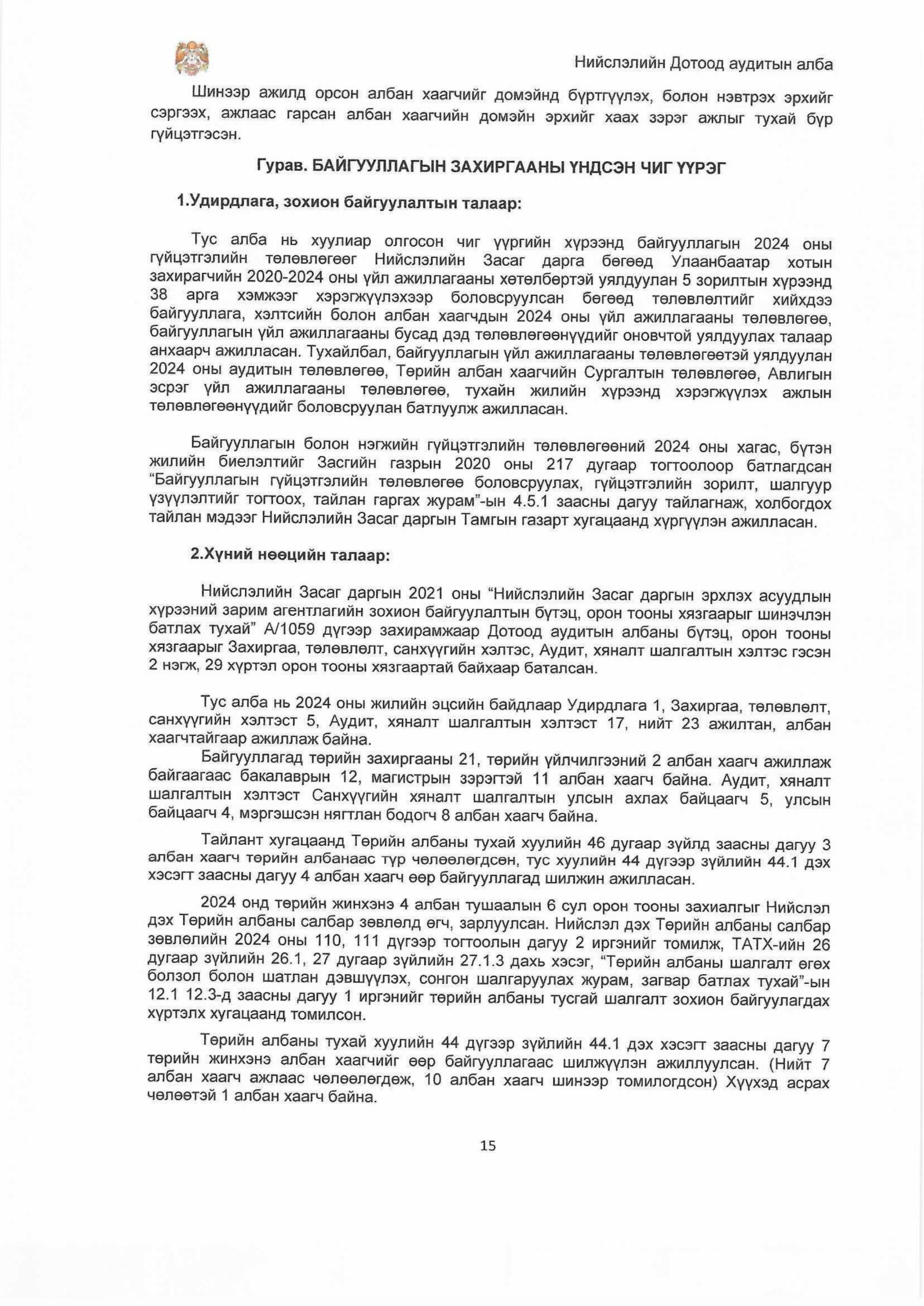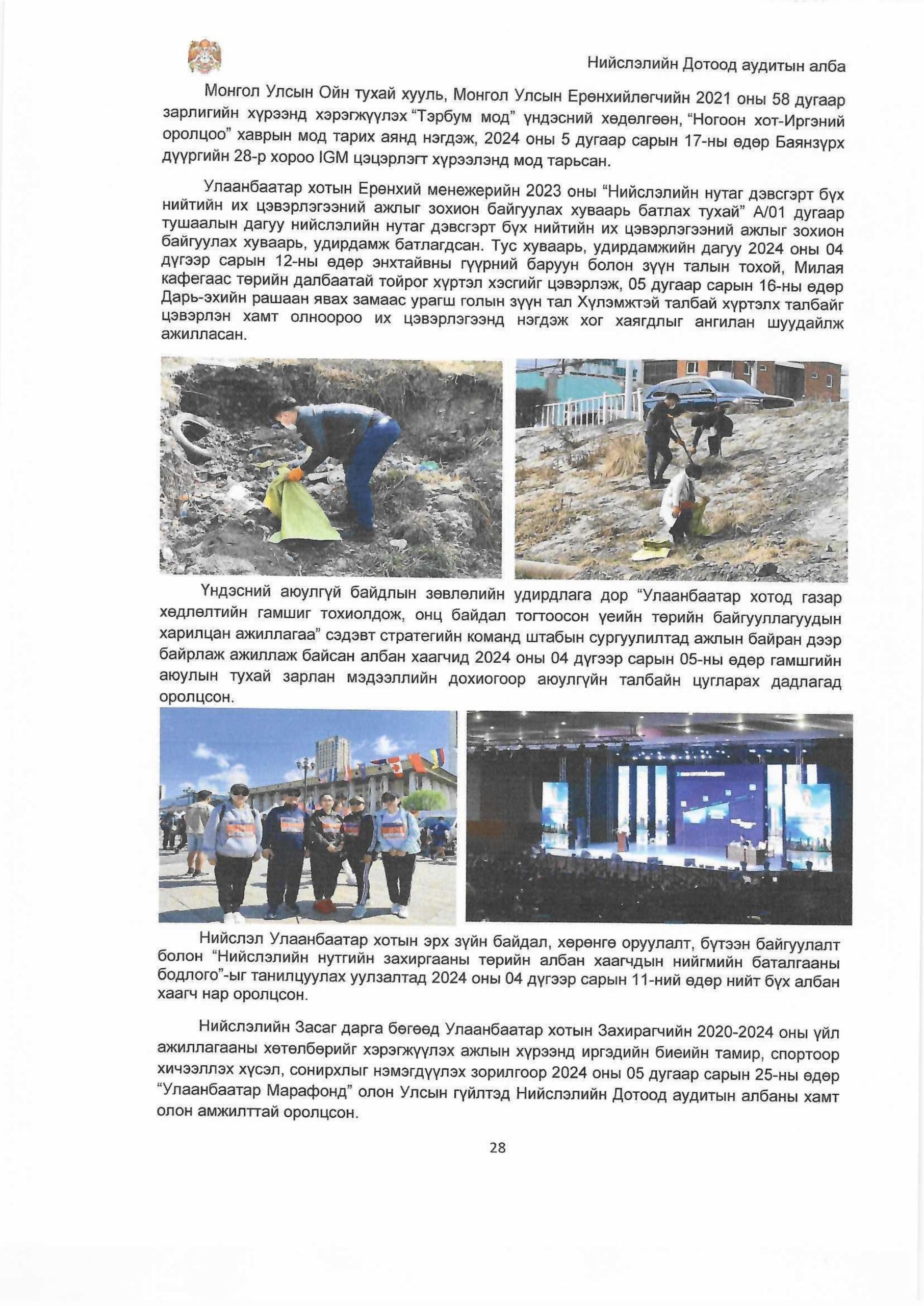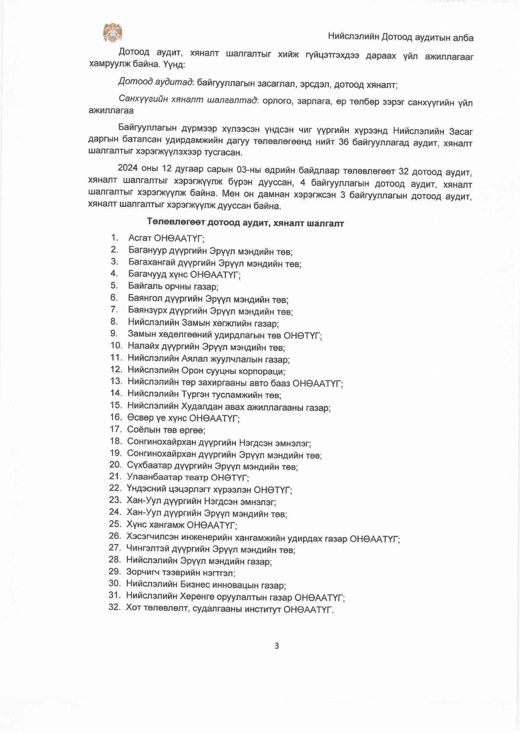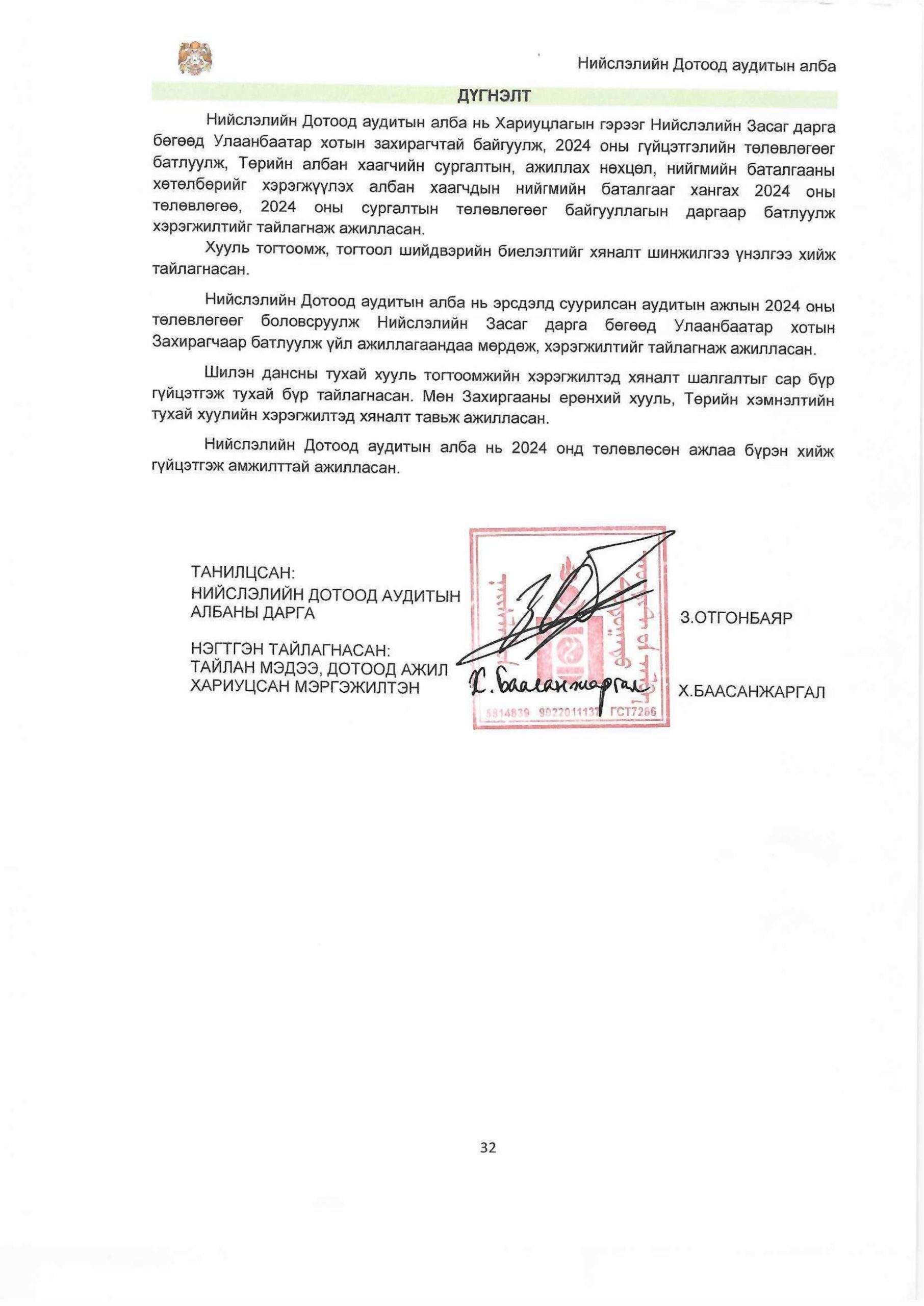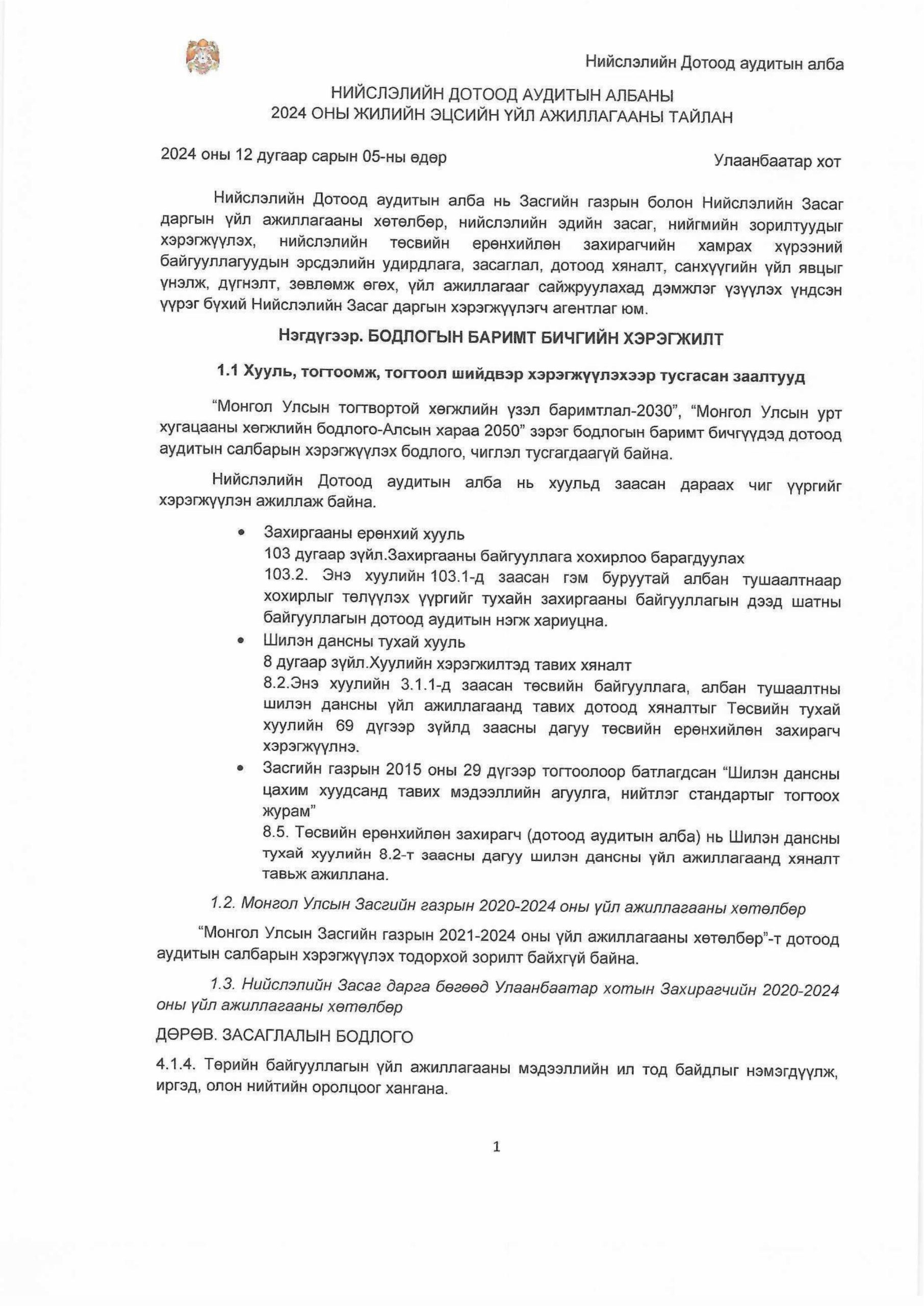 Нийслэлийн Дотоод аудитын албаны Үйл ажиллагааны 2024 оны жилийн эцсийн тайлан